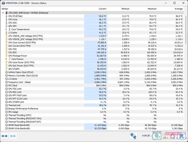 R7 8700G 的 CPU Tdie 55.6 度、GPU 54.7 度,CPU Package 功耗約 81 W。