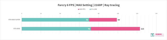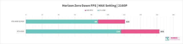 RTX 4080 SUPER 針對遊戲性能對比 RTX 4090,在 4k 2160P 解析度下,平均 FPS -22%,1
