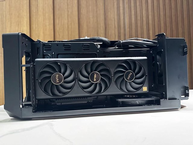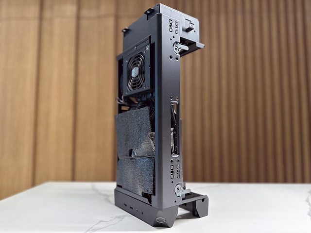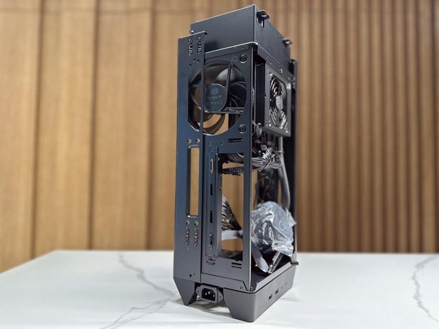 顯示卡與主機板為背對背安裝方式,各自從面板開孔進氣後,從頂部CPU一體水冷及側邊