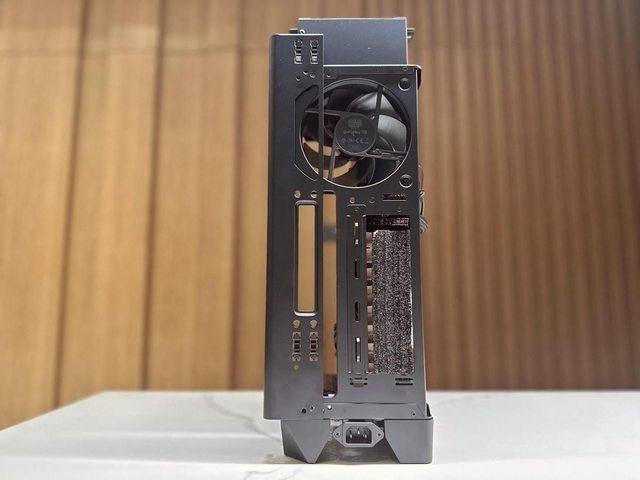 主機板IO及電源接頭集中在機殼後方及下方,顯示卡因為以倒置方式安裝,線材也是從電