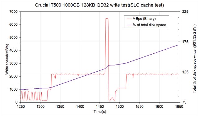 這時候寫了大約100GB的資料才開始降速,而且是耗盡空間的降法