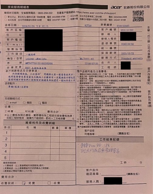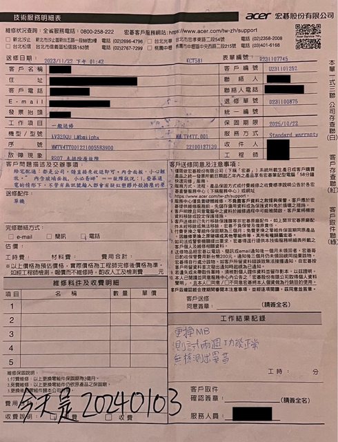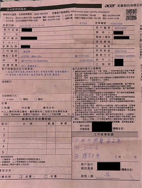 大家新年快樂 過年期間沒有螢幕用 覺得很幹 acer客服也休假 只好上來發個牢騷 這台是2022年11月購入 附上維修單據 客戶編號 0231002570 1.表單編號 R231010366 https://i.imgur.com/lzjDX8F.jpg