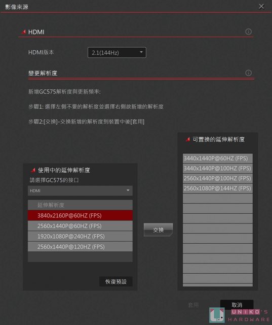 示器型號 GIGABYTE M32UC,目前擷取卡直出最高可以輸出 4K144,因為螢幕有 DSC 串流