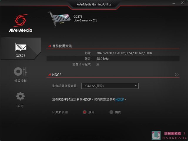 標示擷取卡型號的頁籤中,能控制擷取卡基本功能,確定目前輸入輸出規格,對於 HDCP 高