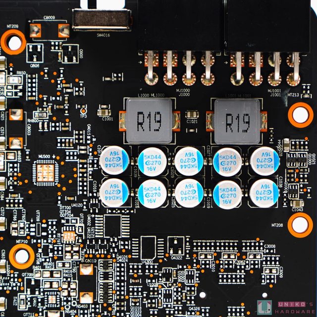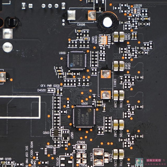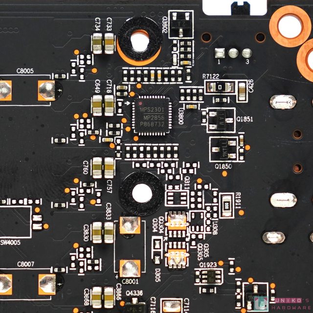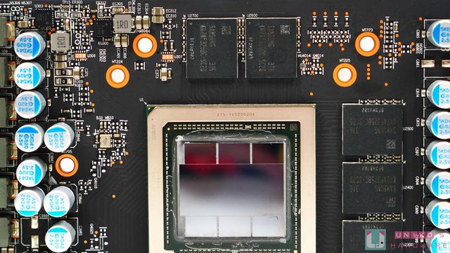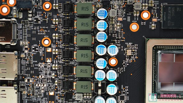 AMD 公版 PCB 的一大特色當然是把主要的輸入電容 (固態電容) 放在 PCI-E 8-PIN 之下,