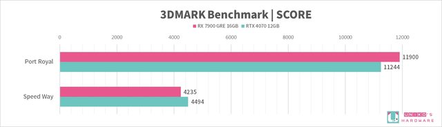 我們實際測試,觀察整體 RX 7900 GRE 性能是贏過 RTX 4070 的,在光追性能上也略贏一