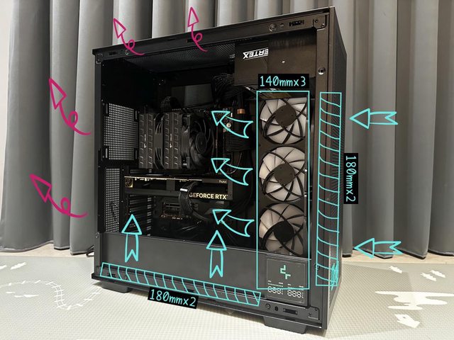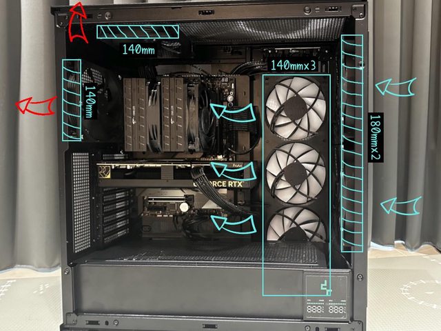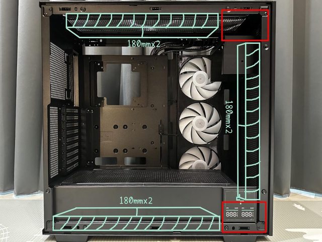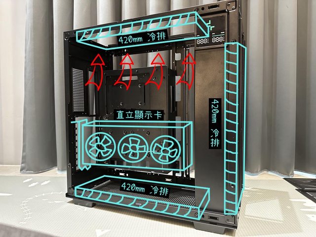 3顆14cm風扇/冷排或是2顆18/20cm風扇將熱風排出,前方還能由12-14cm2顆(視電源長度)