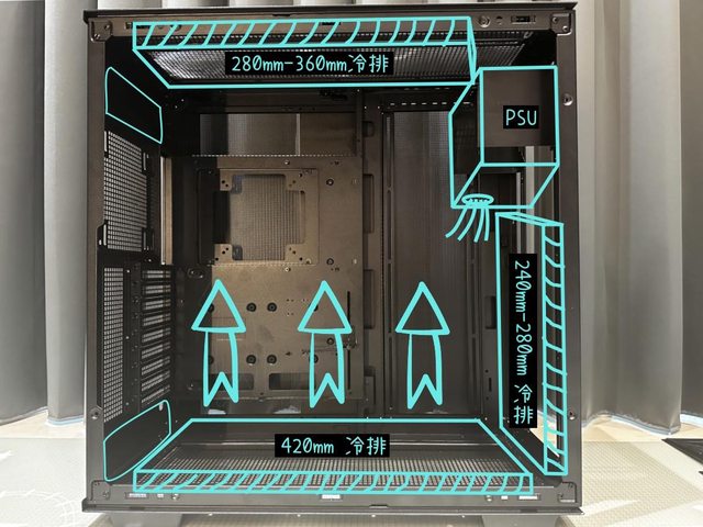 去除了電源倉阻礙讓底部最多能安裝3顆14cm風扇/冷排或是2顆18/20cm風扇,再藉由上方