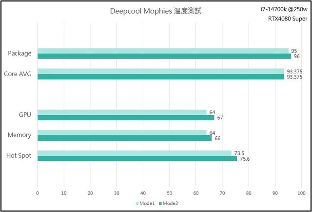 測試結果轉為圖表,兩個模式下CPU溫度沒有明顯差異,也許是因為瓶頸卡在CPU散熱器,