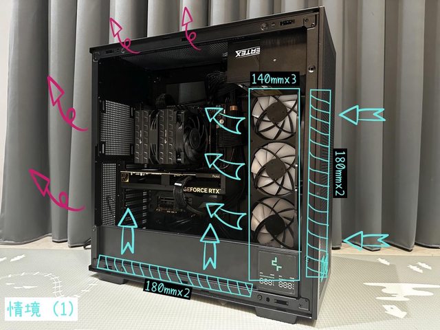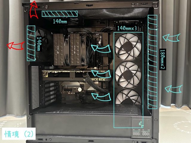 情境(2)則是安裝了2顆18cm風扇、2顆14cm風扇排風,電源下置的模式。