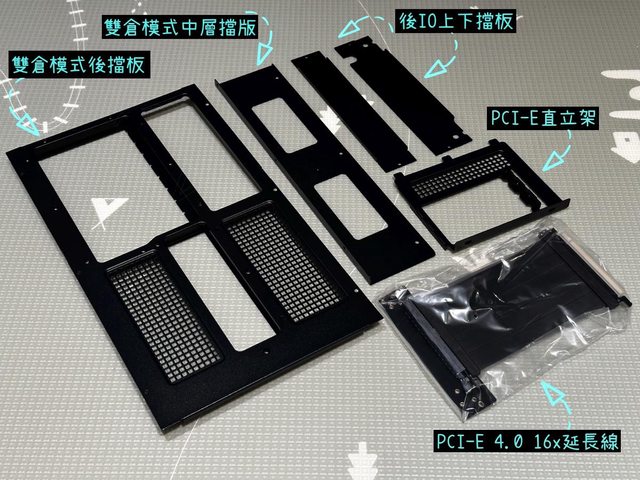 配件除了快成標配的螺絲收納盒外,主要包括切換模式會用到的各式檔板、顯示卡直立架