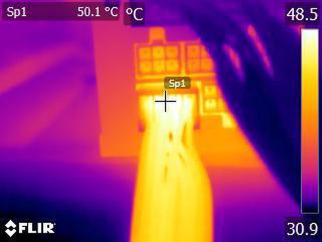 ▼單條EPS 4+4P連續輸出28A(336W)10分鐘後的電源端模組化接頭紅外線熱影像圖(附註: