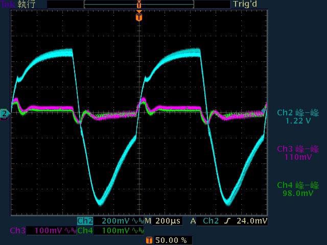 以下波形圖,CH2藍色波形為12V電壓波形,CH3紫色波形為5V電壓波形,CH4綠色波形為