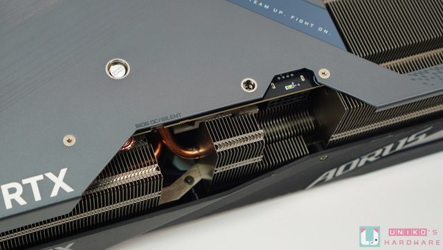 ‧頂部的設計語言點出這張顯示卡的重心,GEFORCE RTX、AORUS、顯示螢幕 (MASTER)。
