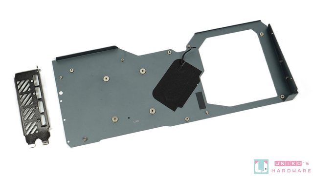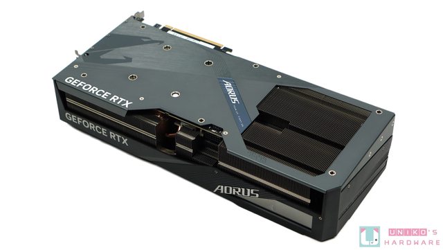 AORUS RTX 4080 SUPER MASTER 金屬背板上沒有任何導熱貼為 PCB 背部提供輔助散熱效果