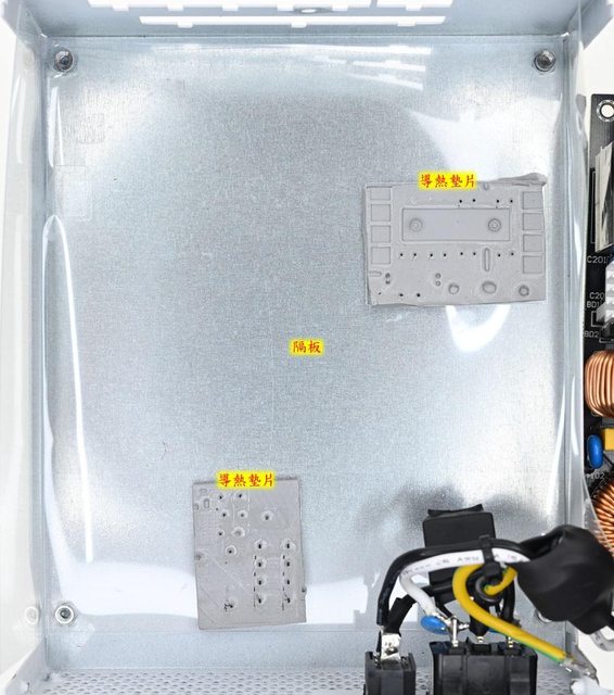 整流、輔助電源電路一次側、二次側的背面有導熱墊片,但只有二次側導熱墊片的隔板有