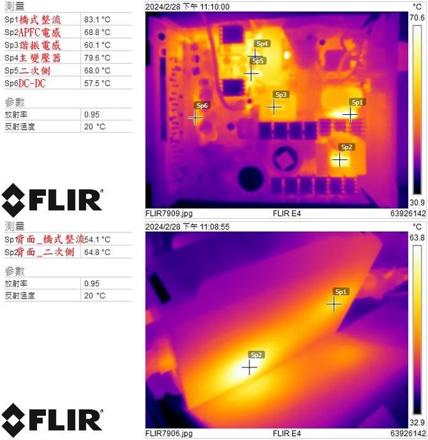 ▼電源供應器滿載輸出下一次側MOSFET(上圖)及諧振電感/主變壓器/二次側(下圖)的紅外