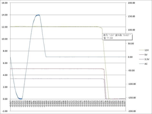 ○綜合全負載輸出狀態切斷AC輸入模擬電力中斷,12V於27ms降至11.34V