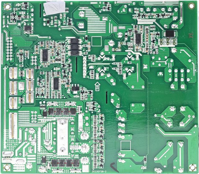 ▼主電路板背面焊點做工良好,大電流線路有敷錫,於部分二次側區域加裝金屬板,輔助