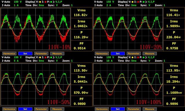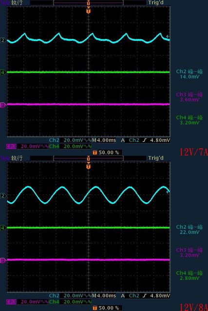○輸出無負載時12V有小振幅低頻漣波,輸出12V/1A時有最小12V漣波,輸出12V/8A以上