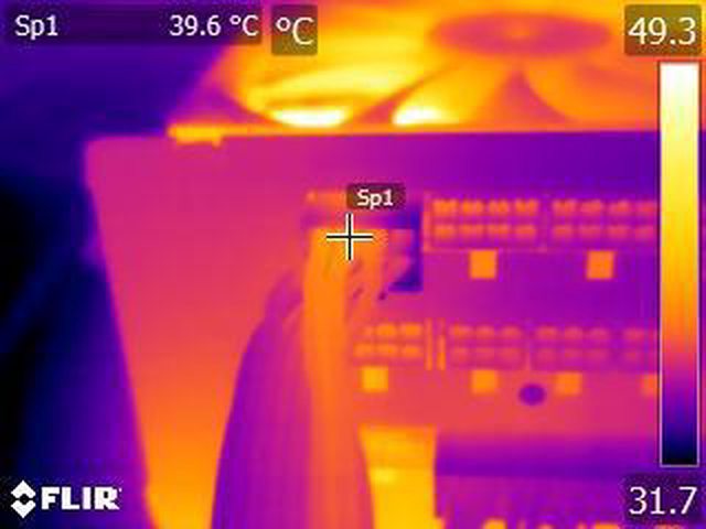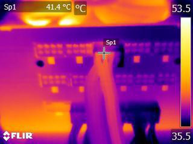 ▼單條PCIE 6+2P(雙頭)連續輸出21A(252W)10分鐘後的電源端模組化接頭紅外線熱影像圖