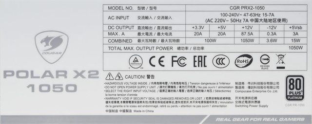 ▼本體背面標籤有COUGAR商標、POLAR X2名稱、1050輸出功率、型號、輸入電壓/電流/頻