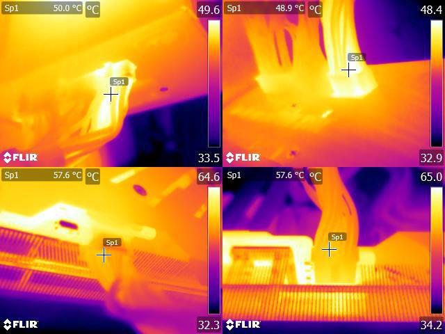 ▼執行FURMARK 30分鐘後電源端插頭(左上/右上)及顯示卡端插頭(左下/右下)的紅外線熱