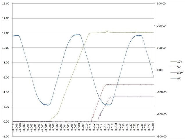 ○電源啟動至綜合全負載輸出狀態,12V上升時間11ms,5V上升時間4ms,3.3V上升時間
