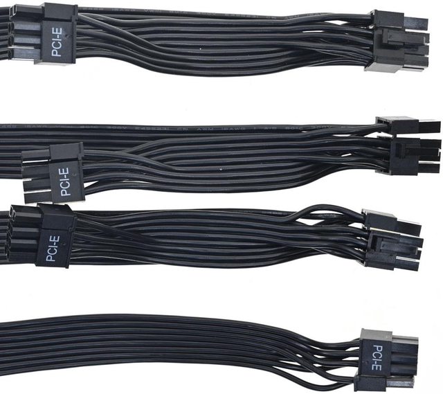 ▼4條顯示卡電源黑色帶狀模組化線路,提供7個PCIE 6+2P接頭,3條雙接頭至第一個接頭