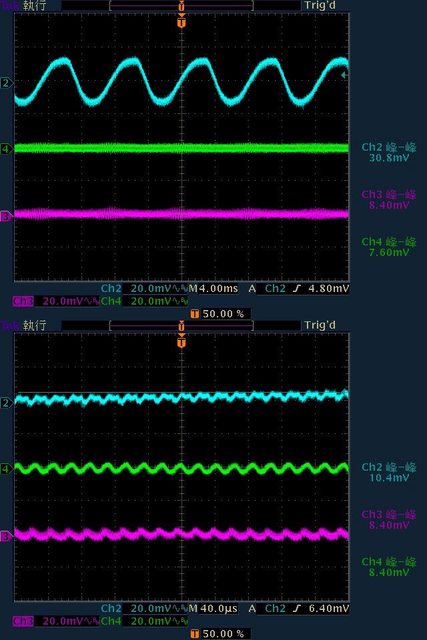 12V漣波波形固定,只改變振幅。於綜合全負載輸出下12V/5V/3.3V各路低頻漣波分別為