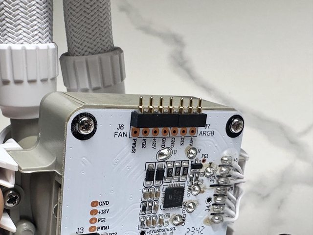 上方為與上蓋接觸的彈簧針腳,提供5V ARGB及PWM風扇訊號。右側為自水冷管延伸而來的