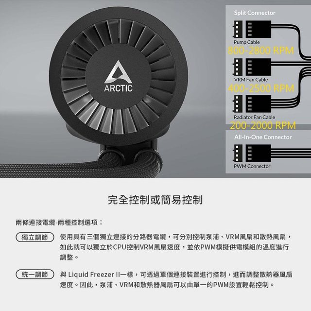 可自由選擇使用整合水泵、冷排風扇及VRM散熱風扇的單一線材,或各自獨立的1分3電源