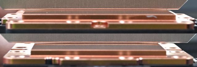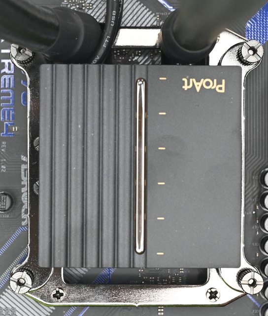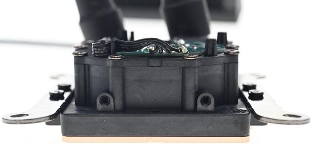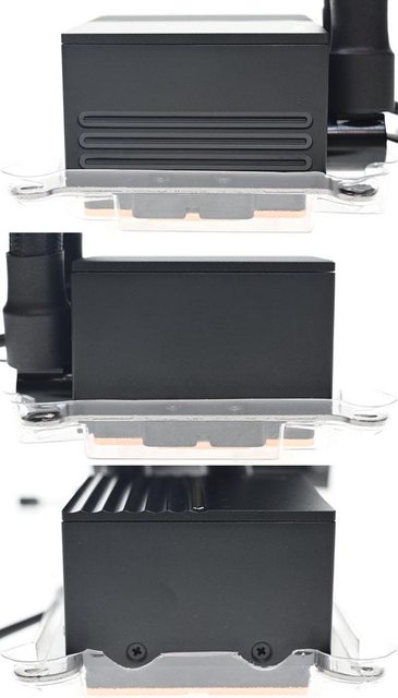 ▼水冷頭處理器接觸面外圍使用特殊沉頭螺絲固定,中間方形凸出部分尺寸47.6×41mm