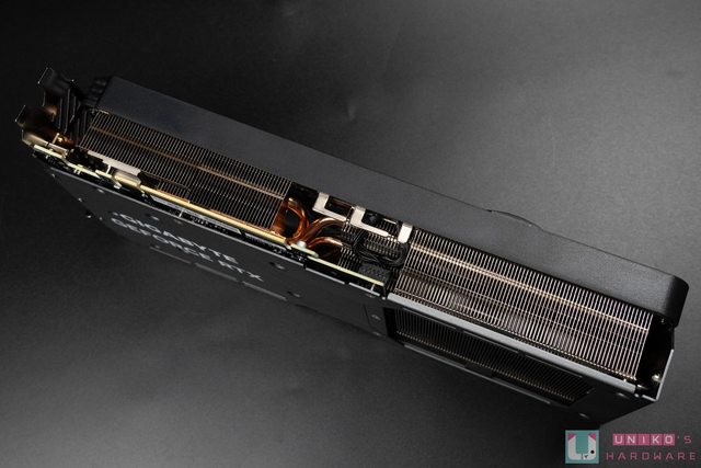 底部同樣能看到大面積散熱鰭片,並且此處隱約可見內部散熱銅管,共有 8 根高效能銅熱