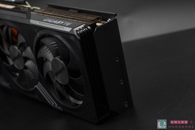 顯示卡尾端部分可見固定用螺絲鎖孔,風扇遮罩部分加入線條點綴,視覺上為圓潤的邊角處