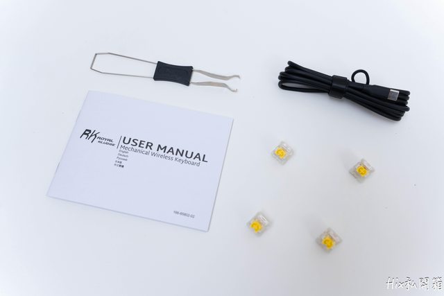 除了鍵盤本體外的配件有鋼絲帽/軸拔除器、4個備用K黃軸、一條傳輸線