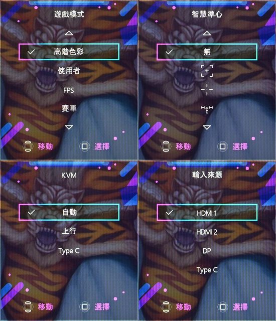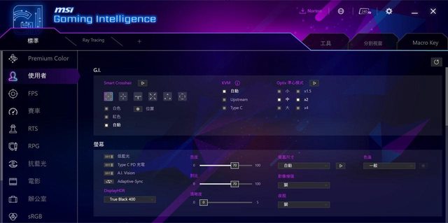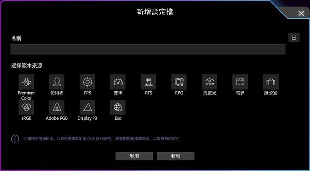 標準分頁左邊有Premium Color(高階色彩)、使用者、FPS、賽車、RTS、RPG、抗藍光、電