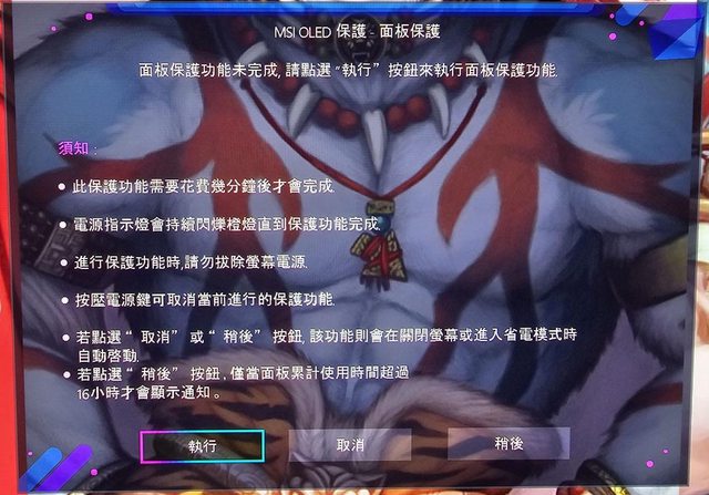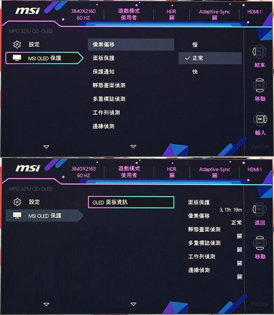 保護、深色護眼模式ON/OFF、像素位移設定、執行面板保護、靜態畫面偵測ON/OFF
