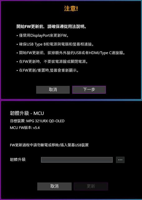 ▼韌體更新,區分為Scaler及MCU更新,更新前要使用DisplayPort連接螢幕,並接上USB