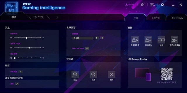 ▼工具分頁有滑鼠、鍵盤、連接無線顯示設備、電源設定、放大鏡、投影、MSI Remote