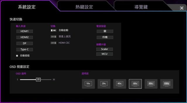 ▼系統設定分頁,可切換輸入來源、自動掃描ON/OFF、自動啟動ON/OFF、螢幕上資訊