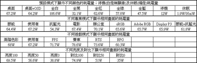 ▼顯示不同顏色、待機、休眠、不同專業模式、不同遊戲模式、不同亮度、不同對比下的