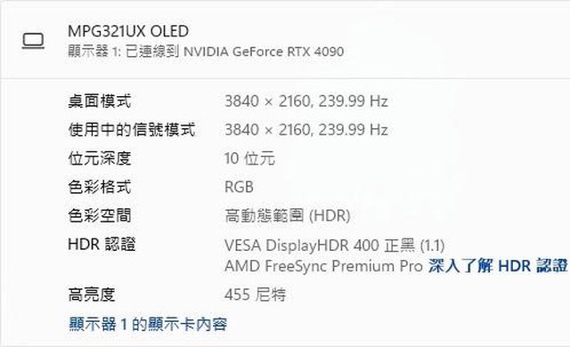 色彩空間。安裝原廠網站下載的顯示器驅動程式後,可正常顯示VESA DisplayHDR 400正