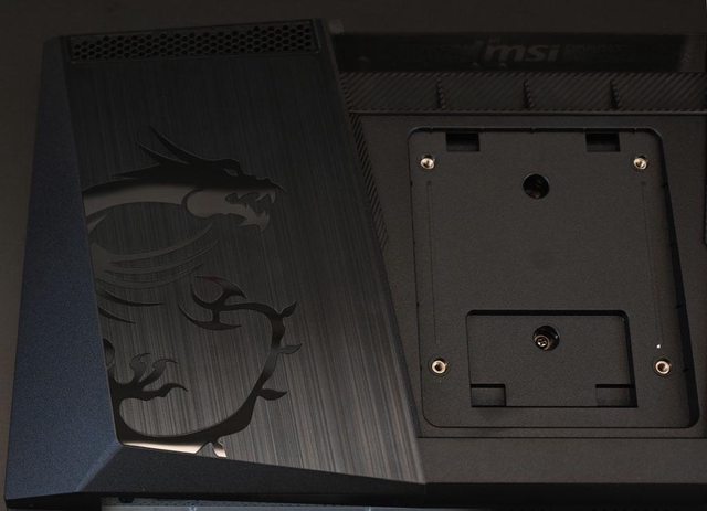 ▼螢幕背面快速拆裝固定座/VEAS固定孔凹槽左側髮絲紋區域有龍圖樣