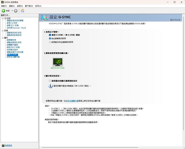 ▼在OSD開啟Adaptive-Sync後,於NVIDIA控制面板可開啟G-SYNC設定選單,不過會出現選