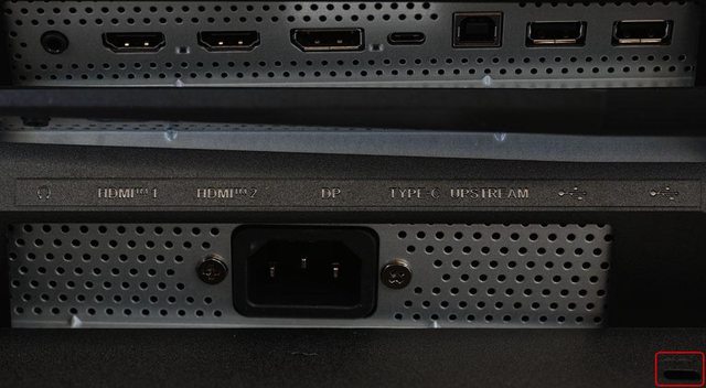 Type-A裝置埠。背面下方右側有IEC C14電源輸入插座及防盜鎖孔(紅框)