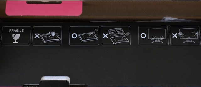 ▼打開外箱,內蓋印上易碎小心輕放標誌、不可用力壓螢幕背後、拆裝支架時需放在底部