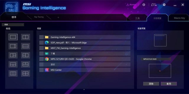 ▼分割視窗分頁有佈局選擇、視窗、視窗預覽、目前顯示器編號
