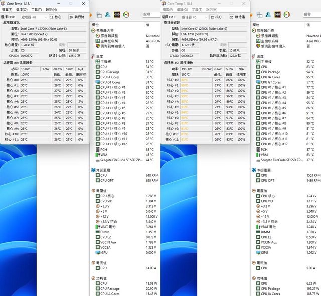 ▼待機(左)及高負載(右)的CORE TEMP及AIDA64感測器畫面