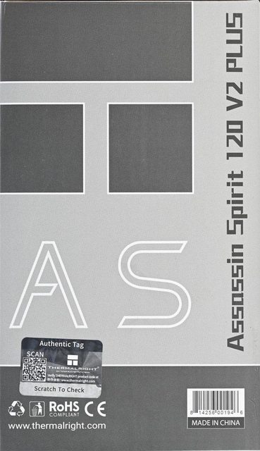 ▼此面外盒有Assassin Spirit 120 V2 PLUS產品名稱、防偽驗證標籤、認證標誌、原廠